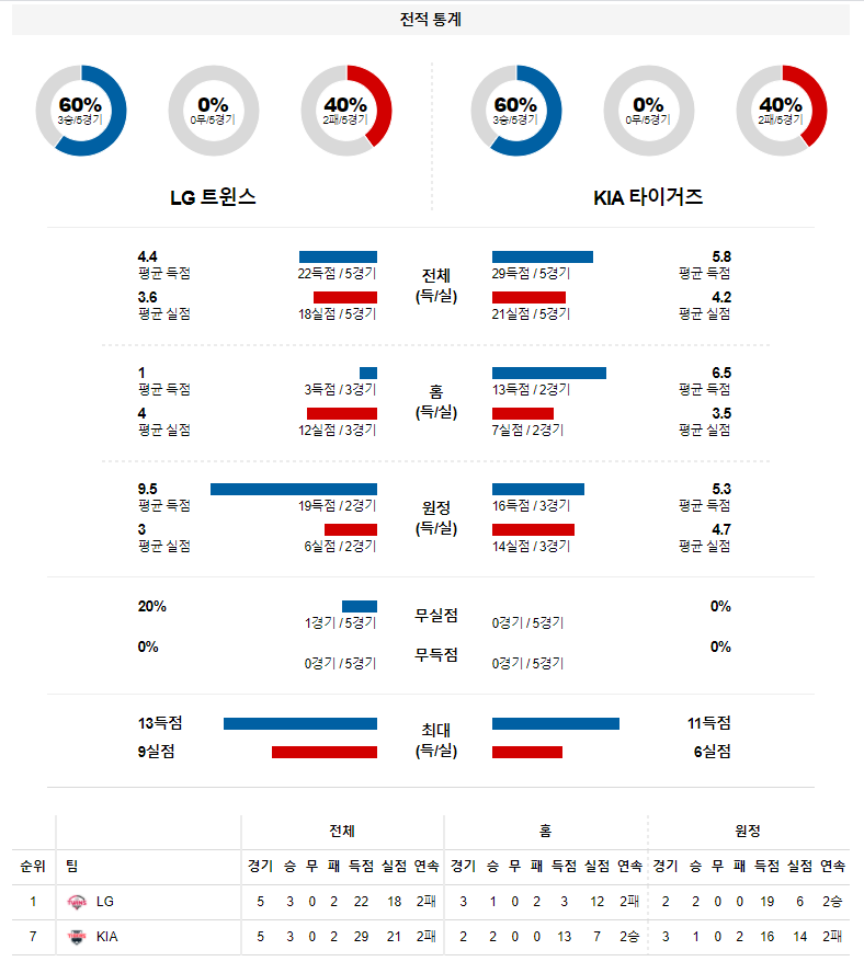 LG는 일요일 홈에서 두산 상대로 1-9 패배를 기록하며 시리즈 1승2패를 기록했다. 2연패 흐름 속에 시즌 7승5패 성적. 2경기 연속 1득점에 그치는 빈약한 득점력이 나타났으며 일요일 경기에서는 LG 마운드의 핵심이 되어야 하는 이민호 투수가 3.1이닝 6실점으로 무너진 경기. 반면, 기아는 일요일 원정에서 SSG 상대로 2-4 패배를 기록하며 시리즈 1승2패를 기록했다. 2연패 흐름 속에 즌 6승7패 성적. 선발 싸움에서 밀렸고 12개 잔루를 남기는 답답한 결정력이 나타난 경기.