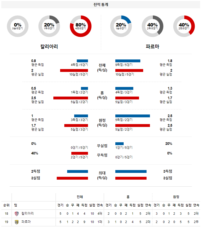 1. 최근 5경기 맞대결 : 5전 2승 2무 1패 7득점 6실점 (칼리아리 우세)