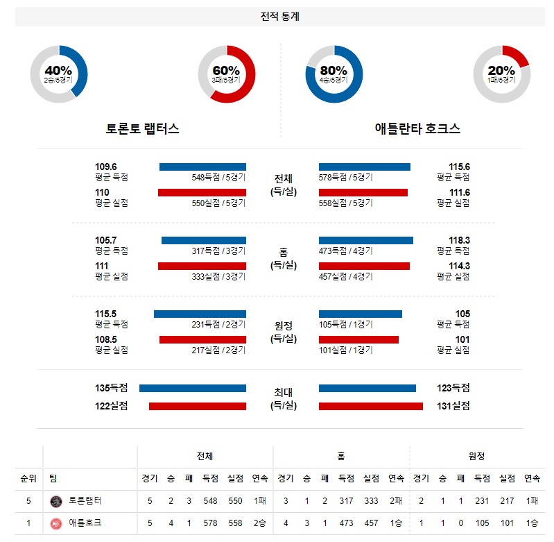 토론토는 밴블리트가 없으니 특유의 외곽 공략이 전혀 이루어지지 않고 있다. 반면 애틀랜타 역시 주축 선수들이 대거 빠진 상황이지만 백업 자원들이 수준급의 실력을 선보이며 공백이 메워지고 있다. 애틀랜타가 승리할 전망이다.