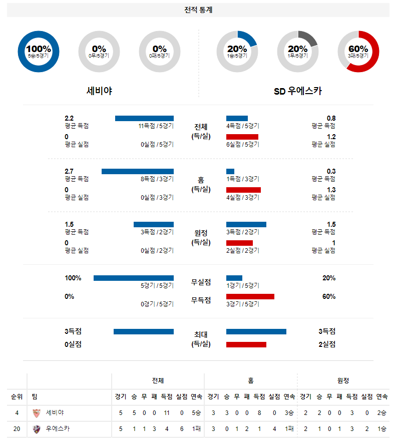 2. 세비야 올 시즌 홈 성적 : 10전 7승 1무 2패 (무실점 비율 : 50%, 무득점 비율 : 20%)