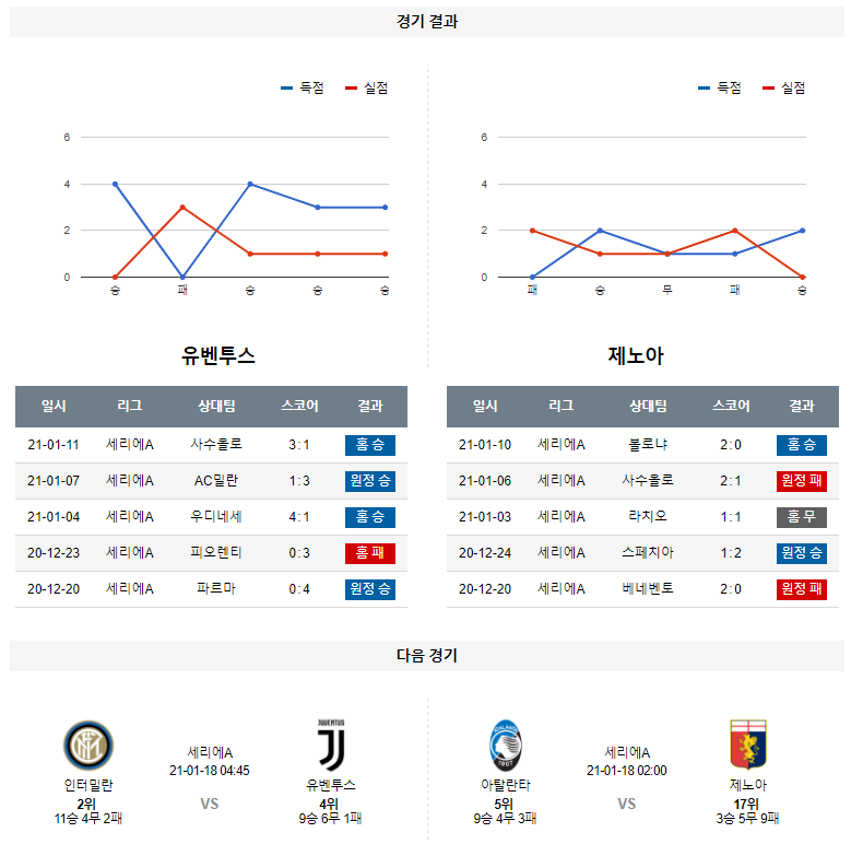 1. 최근 6경기 맞대결 : 6전 4승 1무 1패 10득점 6실점 (유벤투스 우세)
