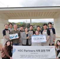 HDC현대산업개발은 23일 우수협력사와 함께 경기 양평에 있는 어메이징 아웃사이더 아트센터를 방문해 인테리어 개보수와 외부 쉼터 조성공사를 위한 모금 기부 전달식을 진행했다. (사진 앞줄 왼쪽부터, 유위동 HDC현대산업개발 윤리경영부문장, 서동일 어메이징 아웃사이더 아트센터장, 장차현실 경기도장애인부모연대 양평지회장, 정…