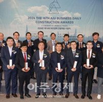 [사진=유대길 기자 dbeorlf123@ajunews.com]23일 오전 서울 중구 한국프레스센터에서 열린 '제16회 2024년 아주경제 건설대상 시상식'에서 수상자와 시상자들이 기념촬영을 하고 있다.사진 앞줄 왼쪽부터 임희석 DL이앤씨 상무, 김기봉 대우건설 주택건축분양팀장, 오세욱 두산건설 상무, 윤홍중 HDC현대산업…
