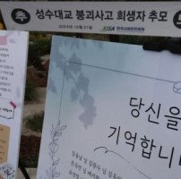 21일 서울 성수대교 북단 위령탑 앞에서 열린 성수대교 붕괴사고 30주기 합동위령제에 애도하는 글귀들이 붙어 있다.