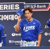 삼성 박진만 감독, 강민호, 김영웅(왼쪽부터)이 20일 광주 라마다플라자 충장호텔에서 열린 2024 KBO 한국시리즈 미디어데이 행사에서 인사를 하고 있다.2024. 10. 20.광주 | 최승섭기자 thunder@sportsseoul.com