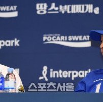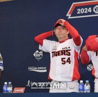 KIA 이범호 감독, 삼성 박진만 감독이 20일 광주 라마다플라자 충장호텔에서 열린 2024 KBO 한국시리즈 미디어데이 행사를 기다리며 모자를 고쳐쓰고 있다.2024. 10. 20.광주 | 최승섭기자 thunder@sportsseoul.com