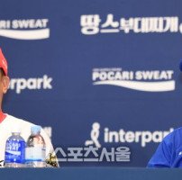 KIA 이범호 감독, 삼성 박진만 감독이 20일 광주 라마다플라자 충장호텔에서 열린 2024 KBO 한국시리즈 미디어데이 행사를 기다리며 이야기를 나누고 있다.2024. 10. 20.광주 | 최승섭기자 thunder@sportsseoul.com