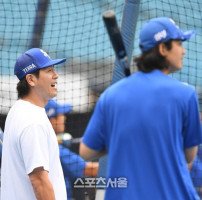 삼성 구자욱(오른쪽)이 15일 대구 삼성라이온즈파크에서 열리는 2024 KBO리그 LG와의 플레이오프 2차전에 앞서 타격 훈련을 하던 중 박병호와 이야기를 나누고 있다. 2024. 10. 15.대구 | 박진업 기자 upandup@sportsseoul.com