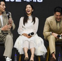 배우 김태리(가운데)가 23일 오전 서울 영등포구 콘래드 서울 그랜드볼룸에서 열린 영화 '외계+인' 제작발표회에 참석해 인터뷰하며 발을 구르고 있다. /윤웅 기자 외계+인 '엄지 척!'.[더팩트ㅣ윤웅 기자] 배우 김태리(가운데)가 23일 오전 서울 영등포구 콘래드 서울 그랜드볼룸에서 열린 영화 '외계+인' 제작발표회에 참…
