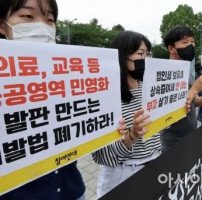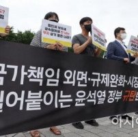 참여연대 관계자들이 20일 서울 용산구 대통령 집무실 앞에서 국가책임 외면·규제완화·시장만능 밀어붙이는 윤석열 정부 규탄 기지회견을 열고 '새정부 경제정책방향' 전면 수정 등을 요구하고 있다./김현민 기자 kimhyun81@