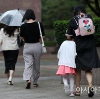 비가 내린 16일 서울 시내에서 한 시민이 딸아이를 팔로 감싼 채 발걸음을 재촉하고 있다./김현민 기자 kimhyun81@