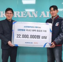 사진=롯데자이언츠 제공 프로야구 롯데자이언츠가 지난 13일 대한항공과 함께 사회공헌 기부 전달 행사를 실시했다. 이날 전달식에는 대한항공 부산여객지점 이상건 지점장과 김진욱이 함께했다. 구단은 파트너사인 대한항공과 함께 부산지역 내 저소득층 가정의 삶의 질 향상과 이동편의, 문화체험 기회 확대를 위하여 2016년부터 현재…
