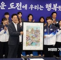 서울시에서 19일 파리올림픽에 출전했던 서울시와 서울시청 소속 선수와 지도자들을 초청해 서울시청에서 격려 오찬 간담회를 열었다. 2연속 올림픽 메달을 획득한 태권도 이다빈 선수가 오세훈 서울시장에게 선수들이 서명한 파리올림픽 포스터를 선물하고 있다.