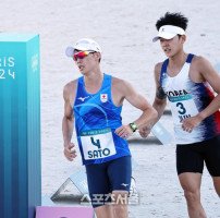 전웅태가 10일(한국 시간) 프랑스 베르사유 궁전 경기장에서 열린 2024 파리올림픽 남자 근대5종 결선에서 레이저런 중 일본의 사토를 추격하고 있다. 전웅태는 6위를 기록했다. 2024. 8. 10.파리 | 박진업 기자 upandup@sportsseoul.com