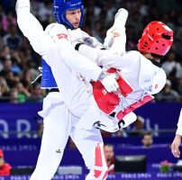대한민국 태권도 국가대표 서건우가 10일(한국 시간) 프랑스 파리 그랑팔레에서 열린 2024 파리올림픽 태권도 남자 80㎏급 덴마크의 에디 흐르니치와의 동메달 결정전에서 양발로 발차기 공격을 하고 있다. 서건우는 0-2로 패하며 메달 획득에 실패했다. 2024. 8. 10.파리 | 박진업 기자 upandup@sportss…