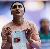 아프가니스탄 육상 선수 카미아 유수피(28)가 지난 2일(현지시간) 프랑스 생드니에서 열린 2024 파리올림픽 여자 100m 예선을 마친 뒤 등번호 뒷면에 적은 ‘교육, 스포츠, 우리의 권리(Education, sport, our right)’를 들어보이고 있다. 기록은 13.42초. 조에서 꼴찌로 들어왔지만 그의 도전은…