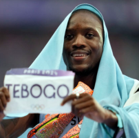 레칠레 테보고(보츠와나)가 8일(현지시각) 프랑스 파리 스타드 드 프랑스에서 열린 2024 파리올림픽 육상 남자 200m 결승전에서 1위로 골인한 후 이름표를 들어 보이고 있다. 파리=AP/뉴시스 아프리카 국가 보츠와나가 역사상 첫 올림픽 금메달 획득을 축하하기 위해 임시 공휴일을 선포했다. 모크위치 마시시 보츠와나 대통…