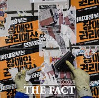 장애인 스티커 부착은 계속전국장애인차별철폐연대(전장연)가 30일 출근길 지하철 선전전을 마무리했다. 전장연은 지하철 스티커 부착으로 투쟁을 이어갈 계획이다. 사진은 서울교통공사 관계자들이 지난해 2월 27일 오전 서울 용산구 삼각지역에서 전국장애인차별철폐연대(전장연)의 부착물 제거 작업을 하는 모습. /이동률 기자[더팩트…