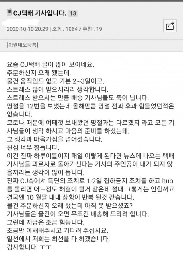 택배 대란 관련 현 종사자 CJ 택배 기사가 쓴 글 작성자 정보 작성자 TOYVER 작성일 2020.10.23 19:42 컨텐츠 정보 조회 23,941 목록 목록 본문 #토이버 #toyver #검증커뮤니티 #먹튀검증업체 #텔레그램cs_toyver 관련자료 댓글 0개 등록된 댓글이 없습니다. 로그인한 회원만 댓글 등록이 가능합니다. 목록 목록