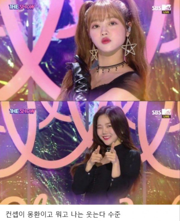 여전사 컨셉이라 카리스마 있게 무표정으로 있어야 되는데 혼자 팬들 보고 좋아서 웃고있음ㅋㅋㅋ